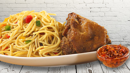 Spaghetti ,a piece of fried chicken with soft drink/water.
