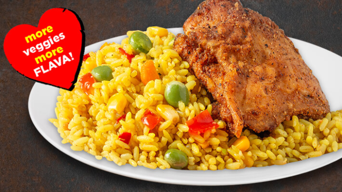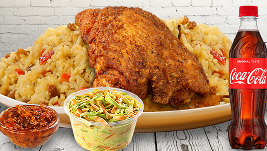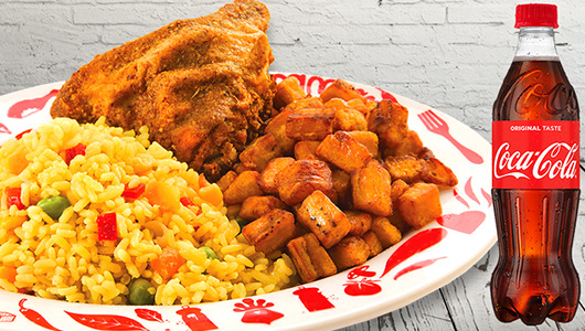 Jellof Rice, a piece of fried chicken with PET Soft drink/water.